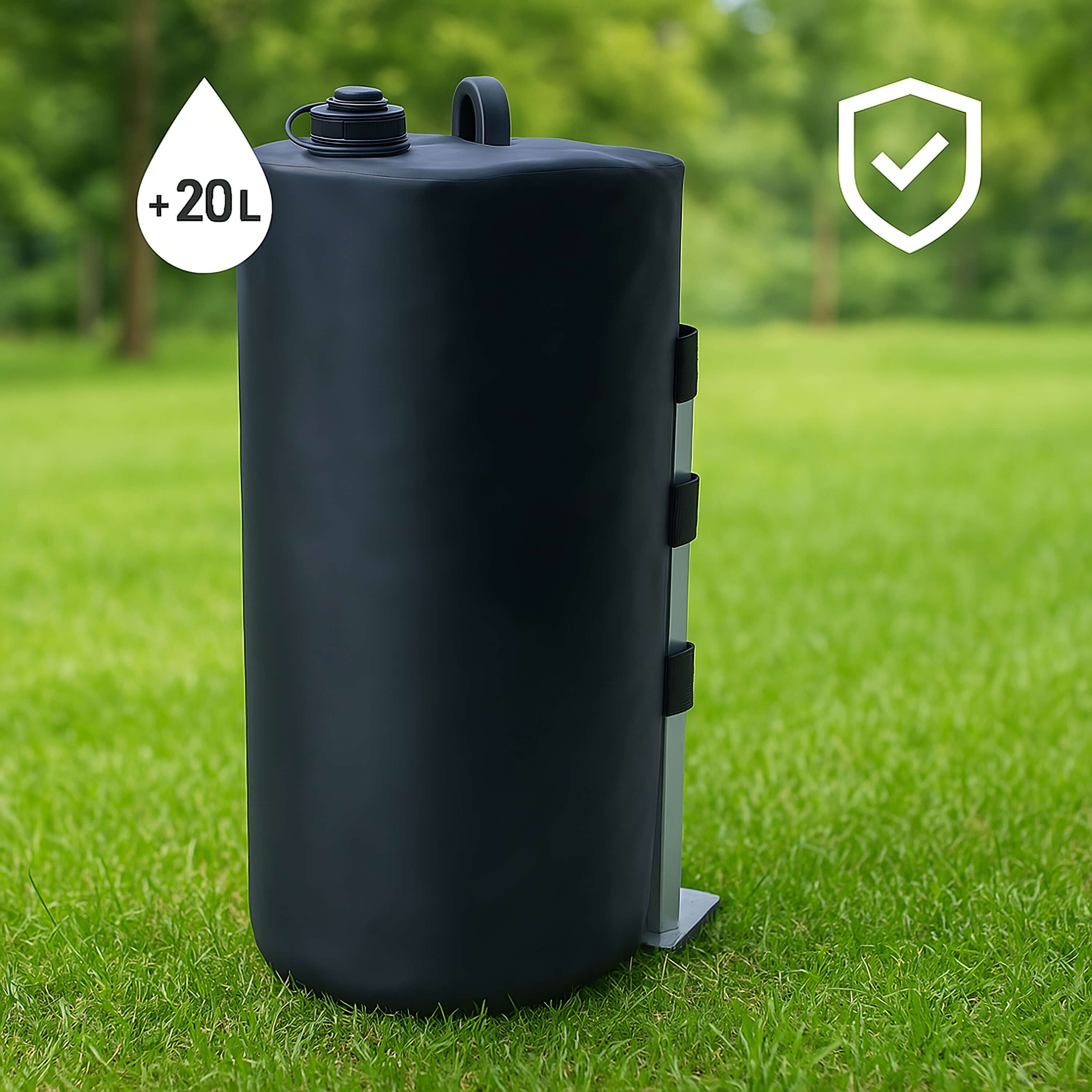 Objem 20 litrů – Po naplnění vodou dosahuje závaží hmotnost 20 kg, což poskytuje dostatečnou stabilitu i při silnějším větru.